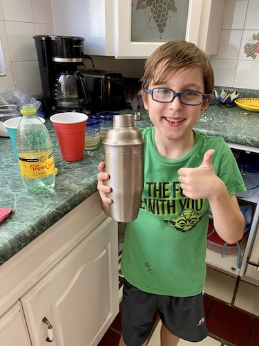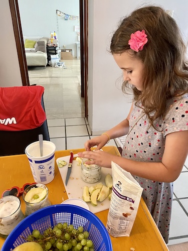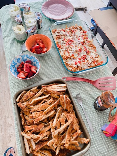 Girl Child decided on layered, yogurt parfaits with granola and grapes and a plate of chocolate-covered strawberries. Boy Child went with a Nutella cups that required no work other than to open the package but, hey, you want to give them ownership. At the last minute, he asked for help making a special drink. Husband made one of his specialty dishes—chorizo nachos—and I made what felt like 400 pounds of chicken fingers… don’t ask.